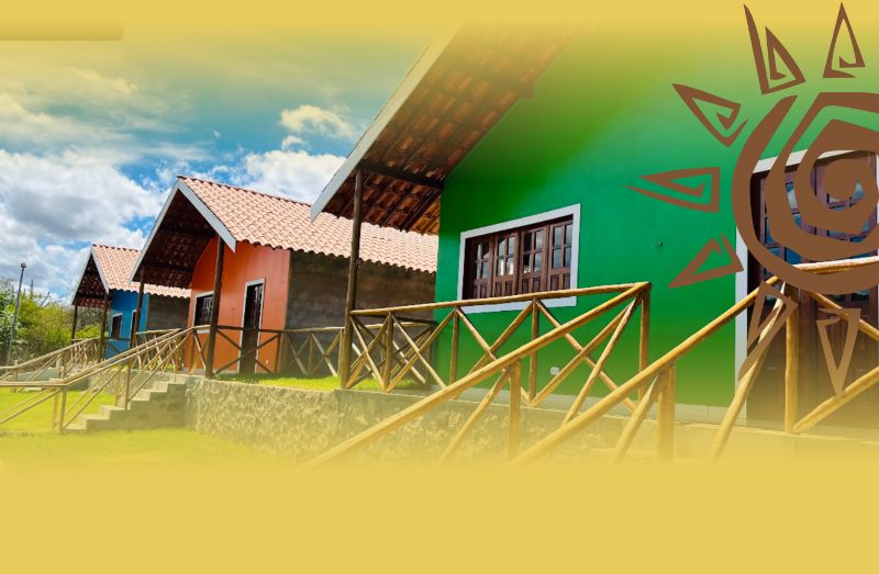 • Acomodações Individuais: São oferecidas cabanas ou casas de férias independentes, de cores vibrantes (como verde e laranja), com telhados coloniais/simples.