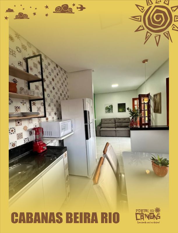 • Áreas de Estar/Cozinha: Pelo menos uma cabana possui sala de estar com sofá e TV (não visível, mas sugerida pelo ambiente), além de uma cozinha americana equipada com eletrodomésticos (geladeira, micro-ondas, fogão/cooktop não claramente visível, mas sugerido), mesa de jantar e utensílios básicos.